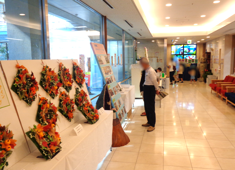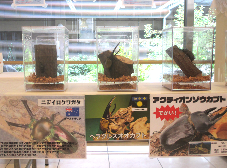 ロビーでは、花時計のクラブ作品の展示や職員による似顔絵コーナー、珍しい昆虫の展示もありました。