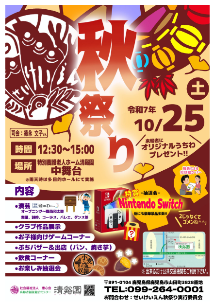 「せいけいえん秋祭り」開催のおしらせ NEW!calendar_today 2025年10月18日 昨年、ご好評いただいた「せいけいえん秋祭り」を、今年も10月25日(土)12:30~15:00に開催いたします。 内容も盛りだくさんでお届けしますので、ぜひ、足をお運びください。 ※駐車場に限りがありますので、お越しの際はできるだけ公共交通機関をご利用下さい。